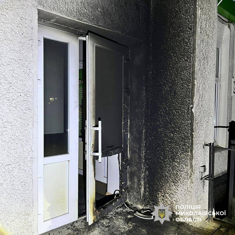 Пошкоджений фасад будівлі банку внаслідок підпалу. Головне управління Нацполіції Миколаївщини