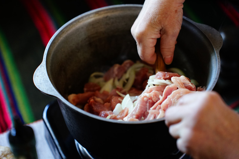 Наталя заздалегідь підготувала гарбуз, діставши з нього кісточки та м’якоть по центру. В розігрітий казан жінка відправляє м’ясо та овочі.
