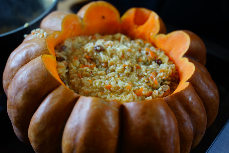 Тим часом плов вже готовий до пересипання у гарбуз, після чого ставиться на годину в піч.