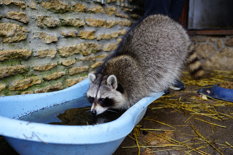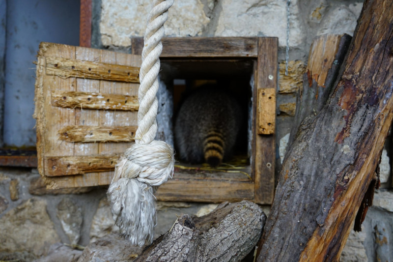 Для обох єнотів облаштували спільний вольєр — із кількома рівнями, канатами, будками та ваннами для води. Рокі часто користується водою — носить туди різні предмети та миє їх, розповідає Оксана.