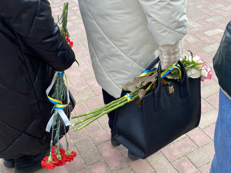 Місцеві жительки стоять із квітами на церемонії прощання Суспільне Миколаїв/Надія Ковтан