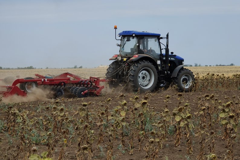 Трактор дискує поле соняшників, що гинуть через посуху на Миколаївщині, серпень 2025 року. Суспільне Миколаїв/Федір Бондар