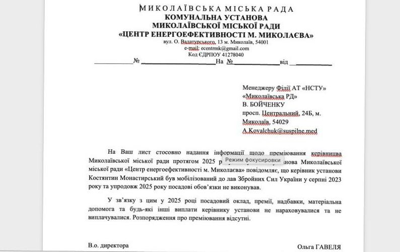 У відповіді комунальної установи зазначено, що керівник установи Костянтин Монастирський був мобілізований до лав Збройних Сил України у серпні 2023 року та упродовж усього 2025 року посадові обов’язки не виконував.