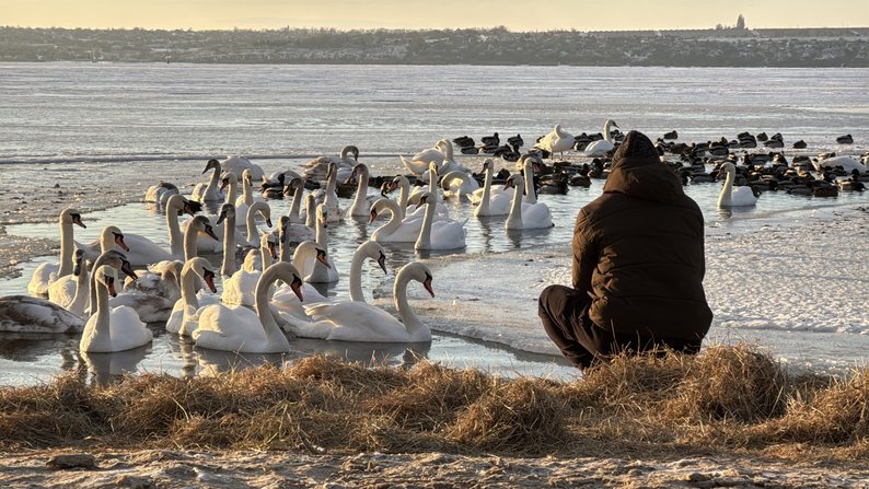Чоловік спостерігає за зграєю лебедів і качок на вкритому кригою узбережжі. Суспільне Миколаїв/Юлія Голокоз У Миколаєві та області протягом 27 лютого очікується хмарна погода. Температура повітря становитиме до +8°C, а вночі впаде до -5°C.