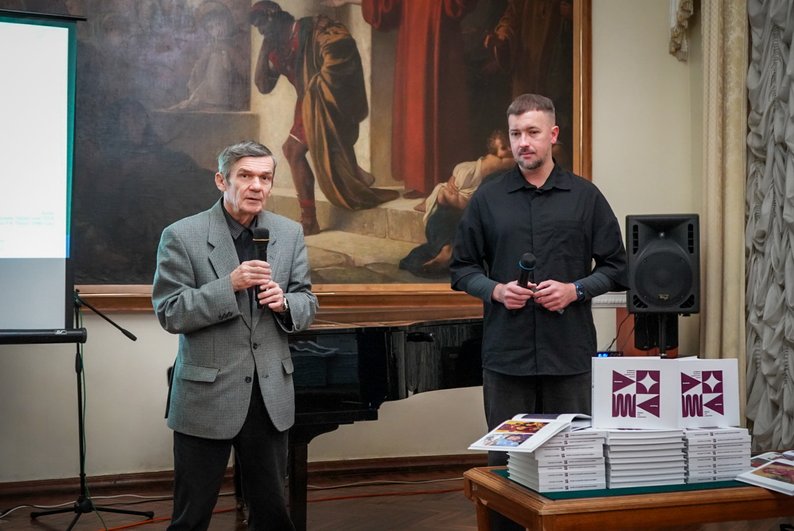 Менеджер проєкту Євген Гомонюк та директор художнього музею Сергій Росляков під час презентації видання. Агенція розвитку Миколаєва
