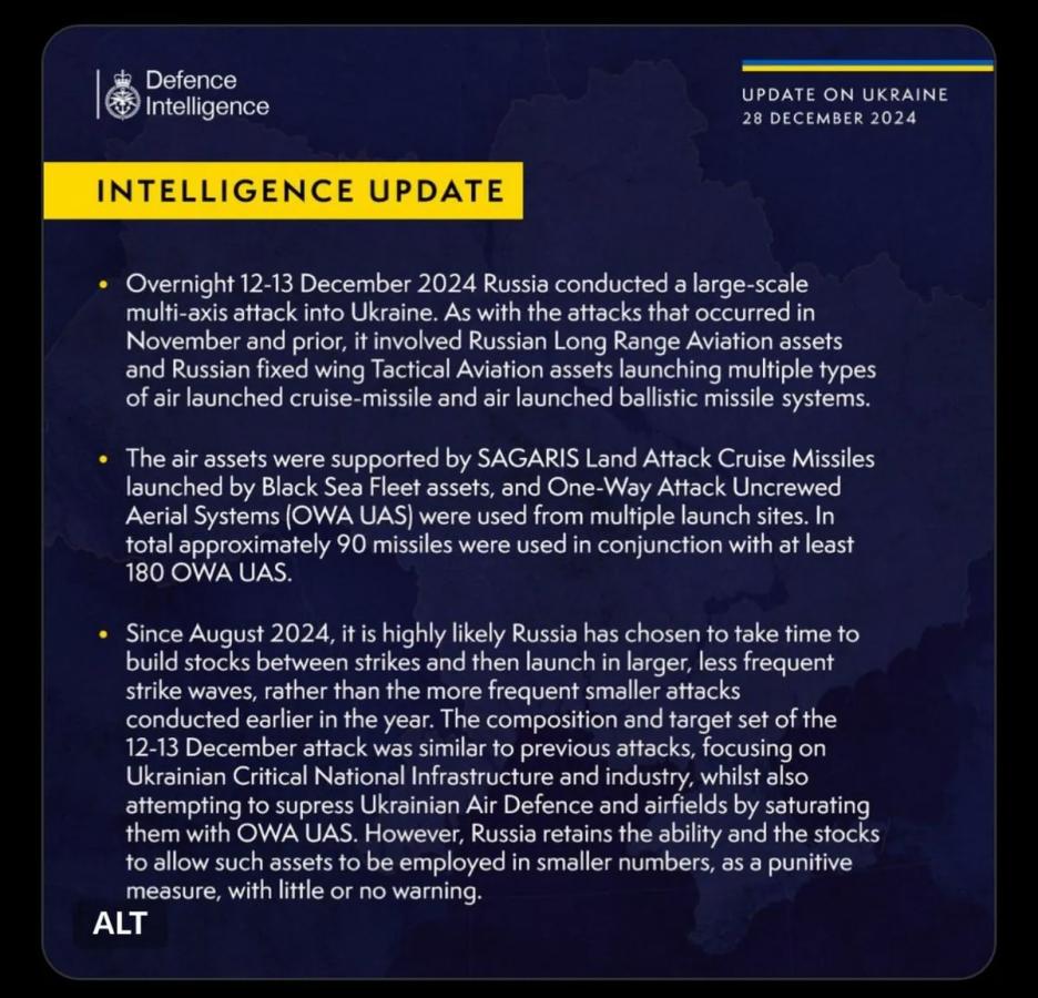 Розвідка Британії пояснила, що у ніч з 12 на 13 грудня 2024 року росія здійснила чергову масштабну атаку на Україну.