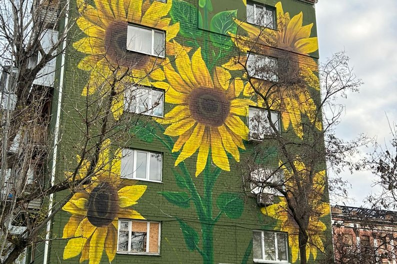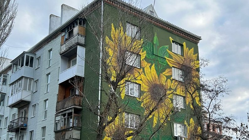 Стінопис на будинку у Миколаєв. Миколаївська міська рада У Миколаєві на фасаді житлового будинку, який був пошкоджений російським обстрілом, з’явився стінопис. Художники зобразили жовтні соняхи.