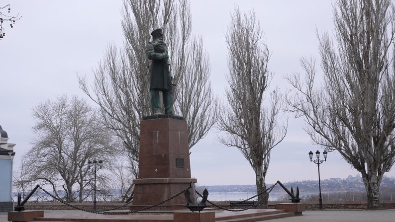 Пам’ятник Степану Макарову на Флотському бульварі в Миколаєві. Суспільне Миколаїв/Маріетта Мкртчян Міський голова Миколаєва Олександр Сєнкевич заявив, що пам’ятник адміралу Степану Макарову підпадає під закон про деколонізацію, однак демонтаж за гроші міського бюджету наразі неможливий через брак фінансування.