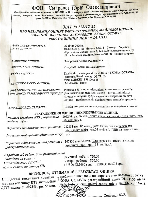 Звіт про незалежну оцінку майнової шкоди. Фото надане Русланом Запорожаном