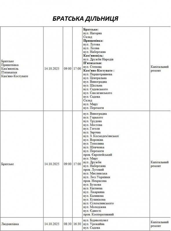 Графік відключення світла по адресах 14 жовтня, Братська дільниця АТ “Миколаївобленерго”