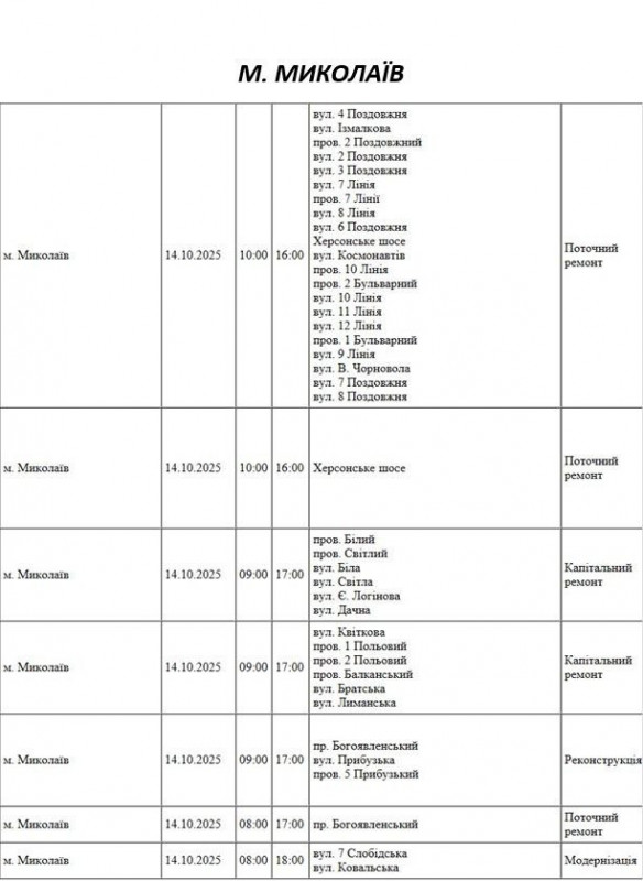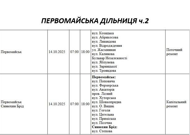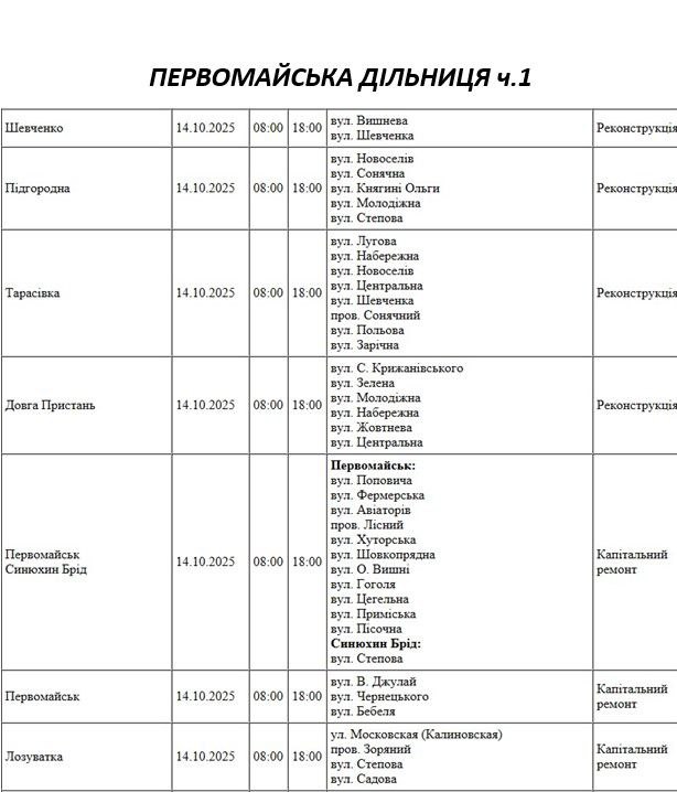 Графік відключення світла по адресах 14 жовтня, Первомайська дільниця світло на миколаївщині 14.10 4 Інші дільниці регіону