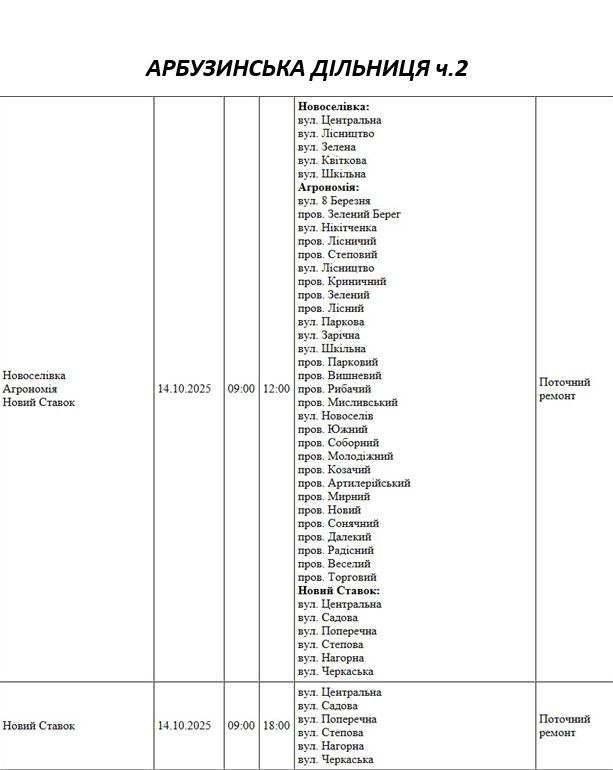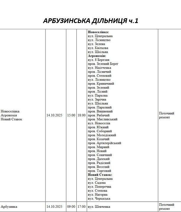 Графік відключення світла по адресах 14 жовтня, Арбузинська дільниця АТ “Миколаївобленерго”