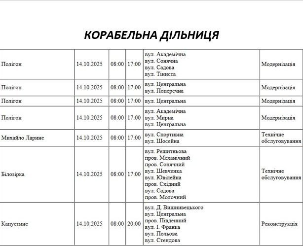 Графік відключення світла по адресах 14 жовтня, Корабельна дільниця АТ “Миколаївобленерго”