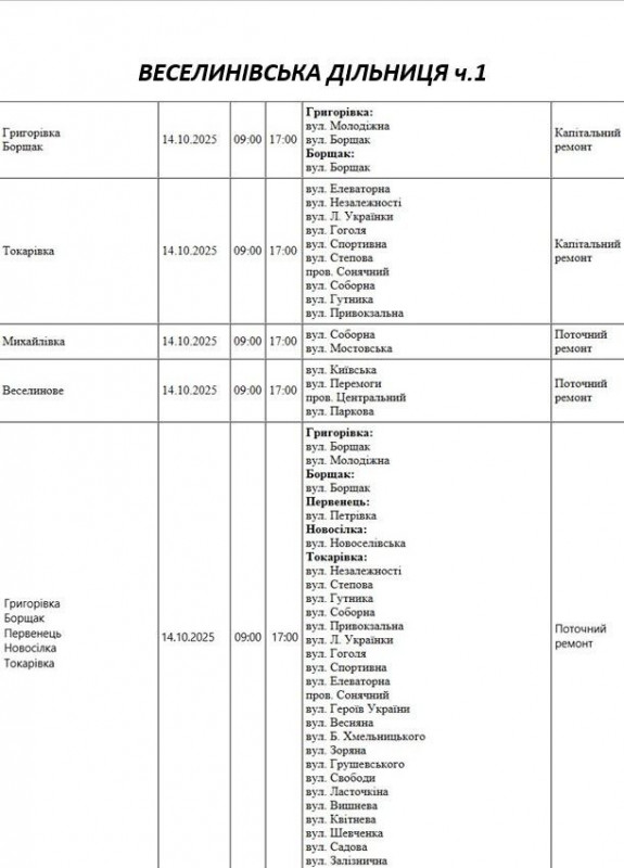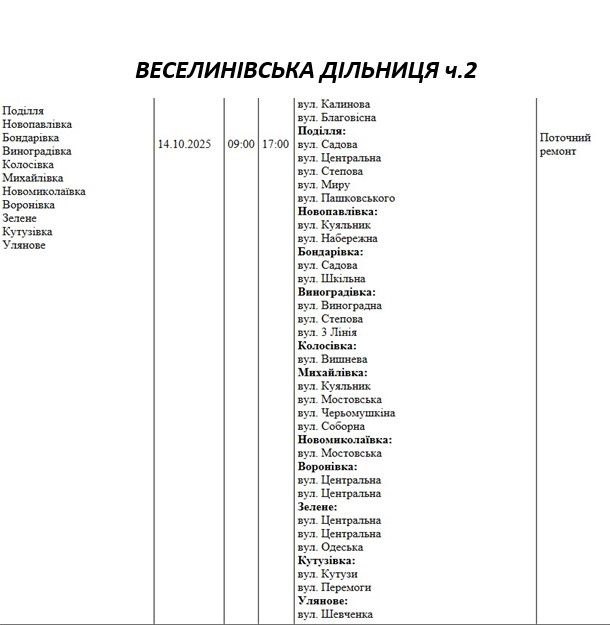 Графік відключення світла по адресах 14 жовтня, Веселинівська дільниця АТ “Миколаївобленерго”