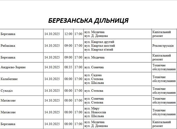 Графік відключення світла по адресах 14 жовтня, Березанська дільниця АТ “Миколаївобленерго”