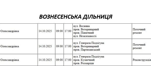 Графік відключення світла по адресах 14 жовтня, Вознесенська дільниця АТ “Миколаївобленерго”