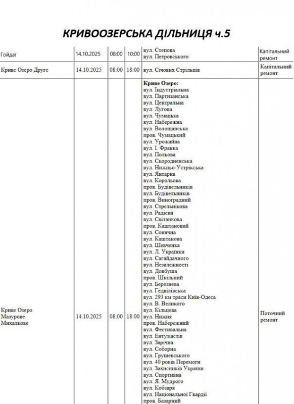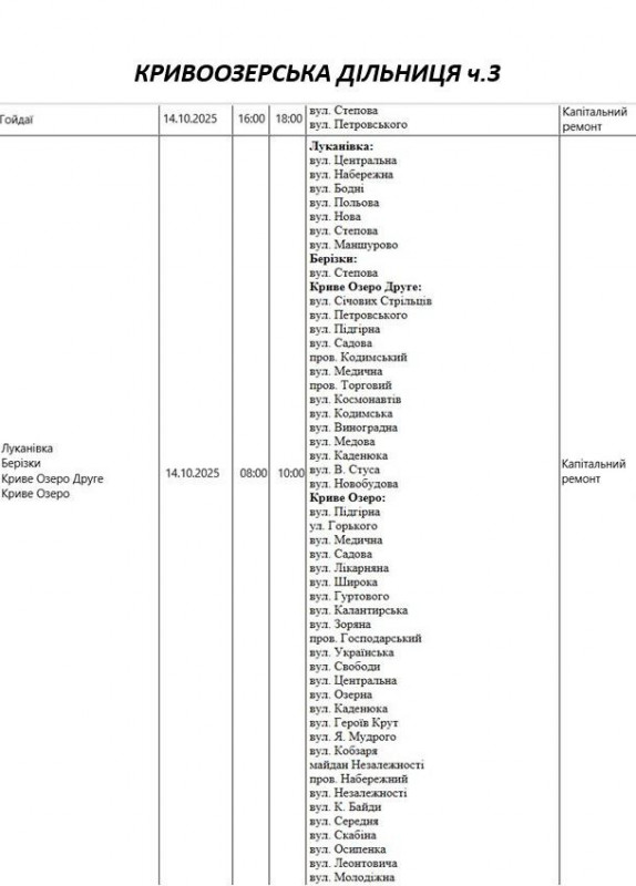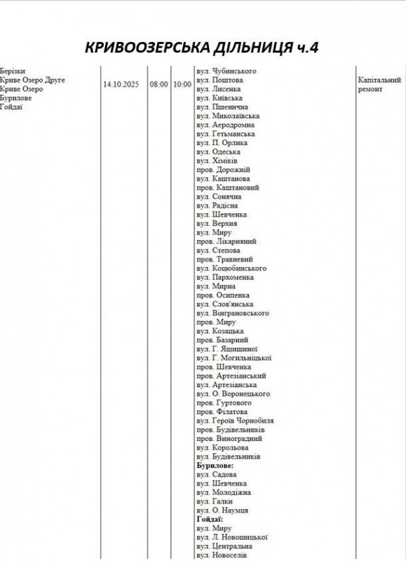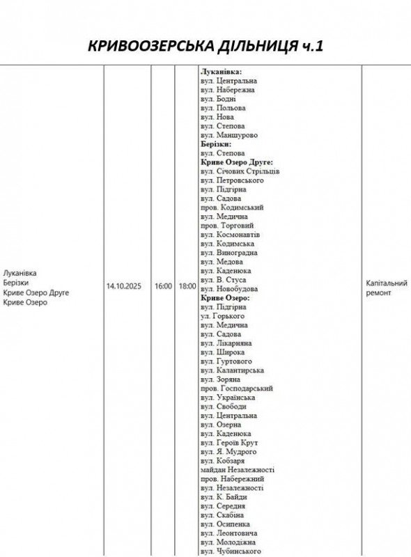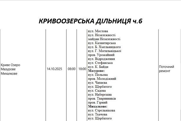 Графік відключення світла по адресах 14 жовтня, Кривоозерська дільниця АТ “Миколаївобленерго”