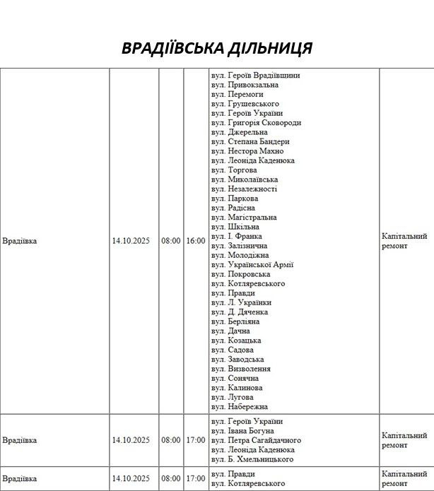 Графік відключення світла по адресах 14 жовтня, Врадіївська дільниця АТ “Миколаївобленерго”