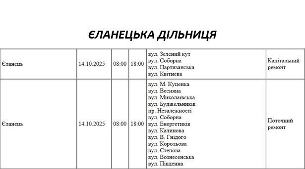 Графік відключення світла по адресах 14 жовтня, Єланецька дільниця АТ “Миколаївобленерго”