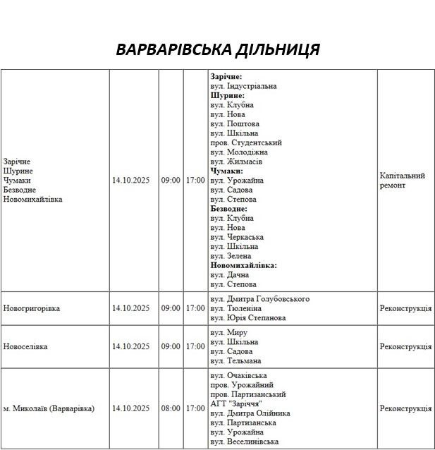 Графік відключення світла по адресах 14 жовтня, Варварівська дільниця АТ “Миколаївобленерго” Арбузинська дільниця