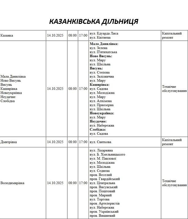 Графік відключення світла по адресах 14 жовтня, Казанківська дільниця АТ “Миколаївобленерго”