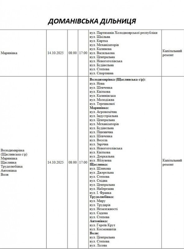 Графік відключення світла по адресах 14 жовтня, Доманівська дільниця АТ “Миколаївобленерго”