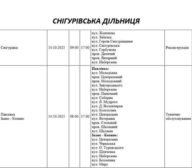 Графік відключення світла по адресах 14 жовтня, Снігурівська дільниця АТ “Миколаївобленерго”