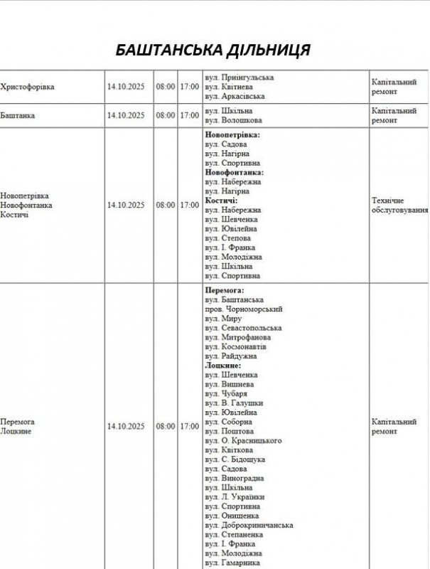Графік відключення світла по адресах 14 жовтня, Баштанська дільниця АТ “Миколаївобленерго”