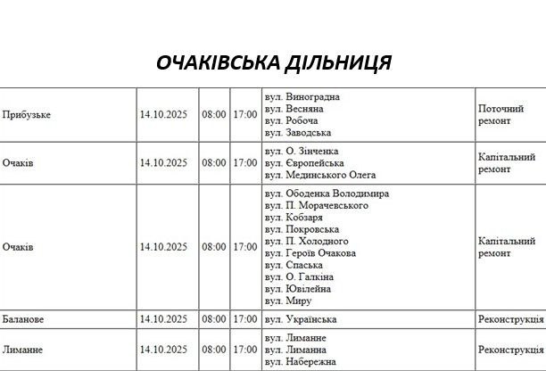 Графік відключення світла по адресах 14 жовтня, Очаківська дільниця АТ “Миколаївобленерго”