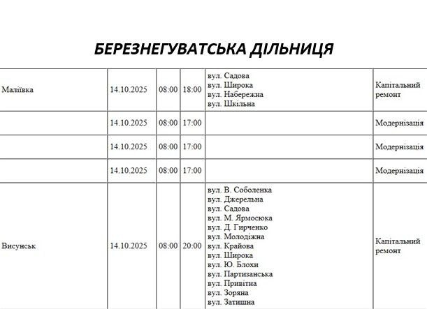 Графік відключення світла по адресах 14 жовтня, Березнегуватська дільниця АТ “Миколаївобленерго”