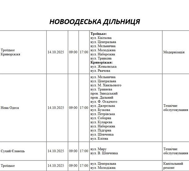 Графік відключення світла по адресах 14 жовтня, Новоодеська дільниця АТ “Миколаївобленерго”