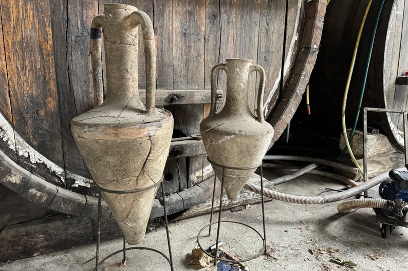 Старовинні амфори, встановлені перед величезною дерев’яною бочкою. Суспільне Миколаїв/Валентина Гурова