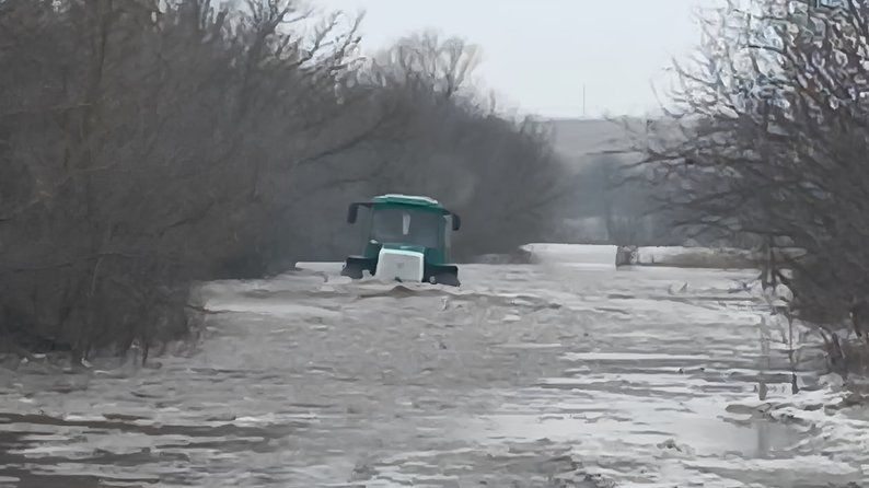 Трактор їде на затопленій ділянці дороги. Фото надане Суспільному рятувальниками У селі Богданівське, що на Миколаївщині, через стрімке підняття рівня води затоплені всі шляхи сполучення. Виїхати з населеного пункту наразі неможливо. Також підтоплені житлові будинки.