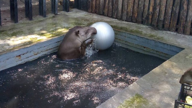 Тапір грається з мячем у воді . Миколаївський зоопарк