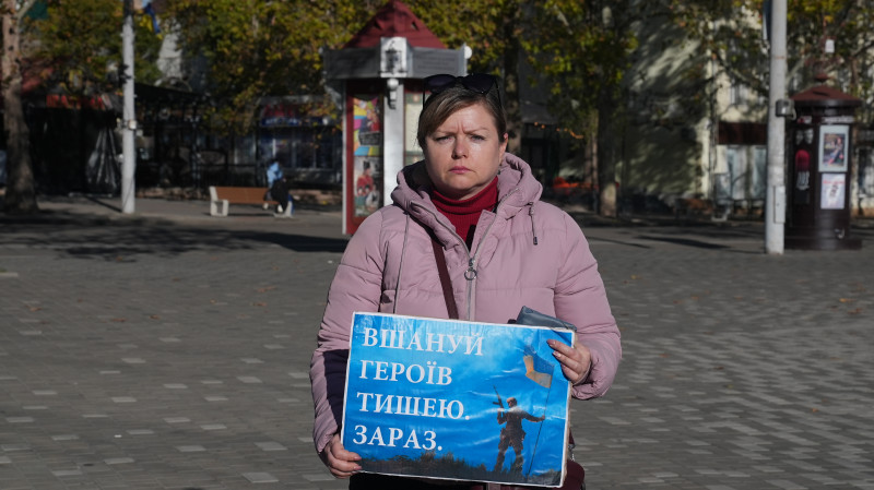 Люди під час хвилини мовчання у Миколаєві. Суспільне Миколаїв/Маріетта Мкртчян У Миколаєві 26 жовтня вчергове відбулася акція "Зупинись. Вшануй". Під час заходу містяни вшанували пам’ять полеглих на війні хвилиною мовчання.
