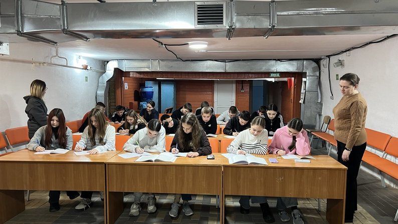 Учні виконують завдання в укритті Казанківської гімназії №1 на Миколаївщині. KSE Foundation У Казанківській гімназії №1 на Миколаївщині завершили ремонт укриття. Це забезпечить очне навчання під час повітряних тривог для 365 школярів і педагогів.