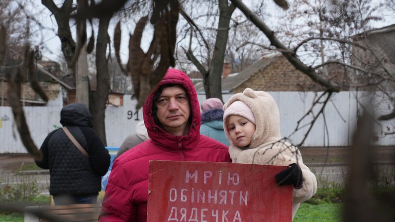 Чоловік з дитиною під час акції-нагадування про полонених та зниклих безвісти військових. Суспільне Миколаїв/Аліна Ковальчук