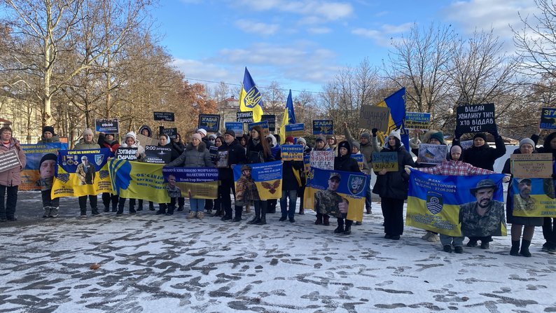 Люди під час хвилини мовчання у Миколаєві, 28 грудня 2025 року. Суспільне Миколаїв/Аліна Ковальчук Жителі Миколаєва вийшли із плакатами та прапорами у центр міста о 9:00, аби вшанувати памʼять загиблих загальнонаціональною хвилиною мовчання. До заходу доєдналися близько 40 людей.