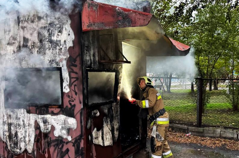 Рятувальник гасить пожежу, що виникла у металевому вагончику на Миколаївщині. Головне управління ДСНС Миколаївщини