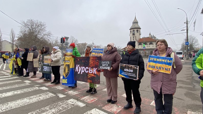 Люди під час хвилини мовчання у Миколаєві, 21 грудня 2025 року. Суспільне Миколаїв/Аліна Ковальчук Миколаївці долучилися до загальнонаціональної хвилини мовчання. З плакатами та прапорами 45 людей вийшли на проїжджу частину, аби вшанувати пам’ять загиблих.