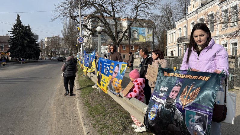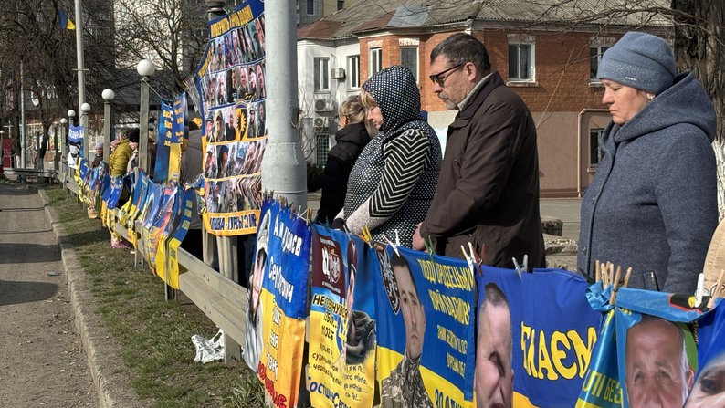 Люди під час акції-нагадування у Південноукраїнську. Суспільне Миколаїв/Юрій Островершенко У Первомайську, що на Миколаївщині, 22 березня відбулася традиційна, щонедільна акція-нагадування про військовополонених та безвісти зниклих.