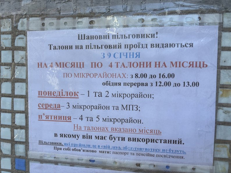"Талони на початку року видали поки що на січень, лютий, березень та квітень. По чотири талони на місяць — це виходить дві поїздки у місяць. Це дуже мало. Пенсія 3700, тож багато не поїздиш. Хотілося б, щоб давали більше", — каже пенсіонерка Марина.
