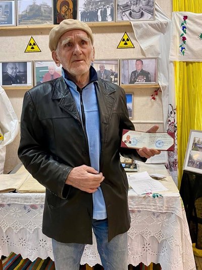 Виставку відвідав Володимир Кладов — учасник ліквідації наслідків аварії на ЧАЕС. Він показав своє посвідчення, а Світлана Корчомна зробила світлину на пам’ять.
