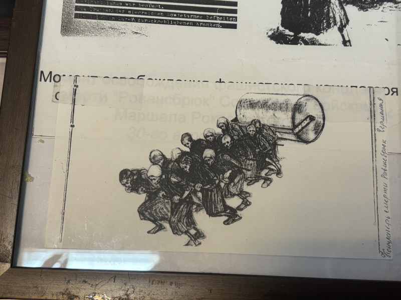 "Більшість вмирала з голоду і виснажувалася працею. Молодих дівчат, 18–19-річних, впрягали. Я хочу показати світлину, як виглядало це. Зараз це техніка робить, кладе асфальт. Малюнок змалювали ці бранці. Це впрягали так дівчат. І вони тягали цей каток, робили дороги асфальтовані в концтаборі. На все життя вони були зламані. Хребет був пошкоджений, болі в хребті", — розповідає Корчомна.