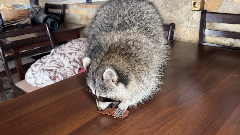 Єнот куштує смаколик . Суспільне Миколаїв/Олександр Гордієнко