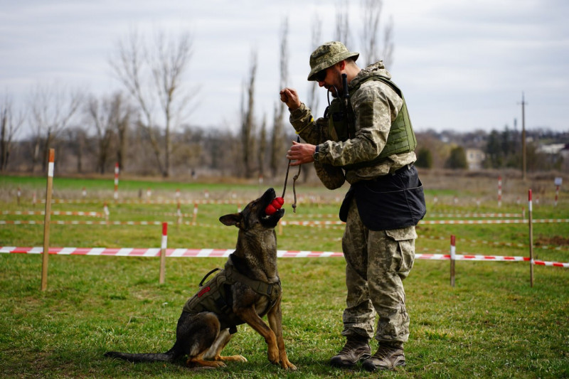"Уявимо, десь є поранений і треба швидко до нього зробити прохід. Я йду першим, проходжу з собакою. Зі мною позаду йдуть сапери, маркують прохід. Обходимо пораненого, перевіряємо і евакуйовуємо", — пояснює кінолог-сапер Михайло.