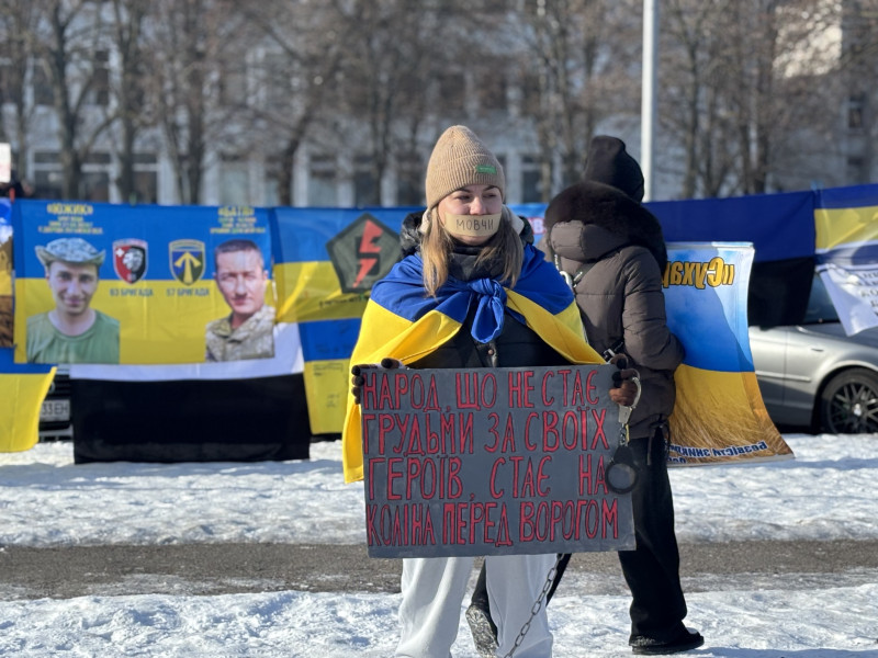 У центрі площі поставили стілець із військовою формою та написом: "Народ, що не стає грудьми за своїх героїв, стає на коліна перед ворогом". Поруч учасниця акції Дарина влаштувала перформанс, який уособлював російську неволю: її руки та ноги були обмотані металевим ланцюгом, а рот заклеєний стрічкою з написом "Мовчи".