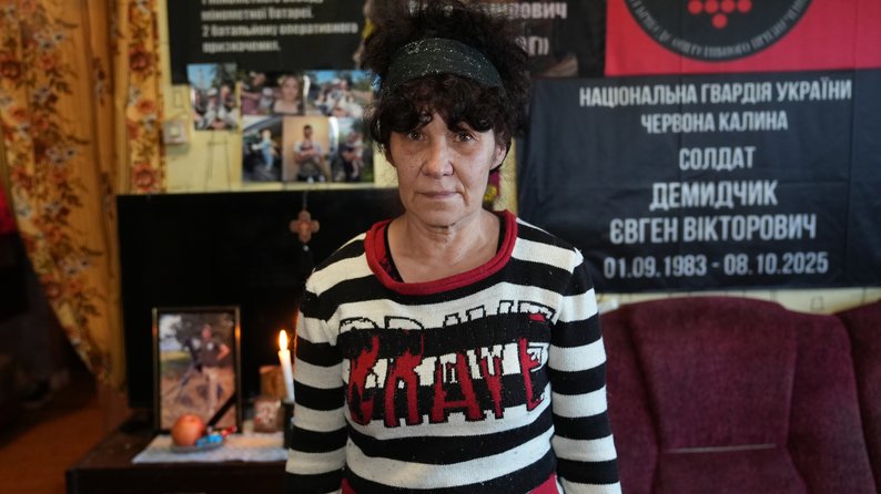 "Ми приходимо на кладовище, плачемо, і прапор просто так бере нас, отак обіймає… Вони не можуть нас обійняти руками. Вони нас прапорами обіймають", — каже Любов Демидчик.